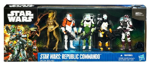 Based on the 2005 video game Star Wars Republic Commando, this set features Delta Squad, a crack Clone Trooper commando unit, as they battle the Trade Federations droid army. The four members of the covert group include stoic leader Boss expert marksman Sev computer hacker Fixer and wisecracking demolitions expert Scorch. Also includes a Geonosian Warrior and battle accessories.